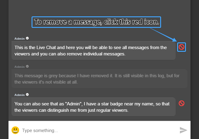 - If you remove a message by clicking the red button on the right hand side of the message, it will turn grey and will still be visible in the log for you. It will, however, not be visible for the viewers any longer.