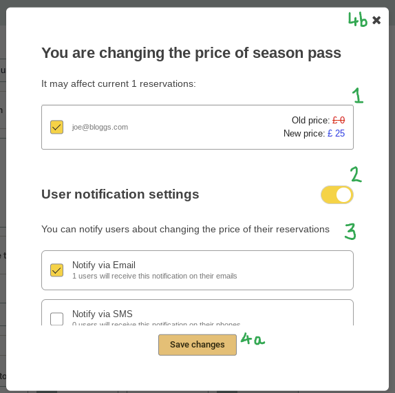 If activated, you will notify your season pass holders that their reservations have been updated. All reservations marked by you as fit for change will be affected. Turning this toggle off means that you do not wish to inform your season pass holders about the change in price.