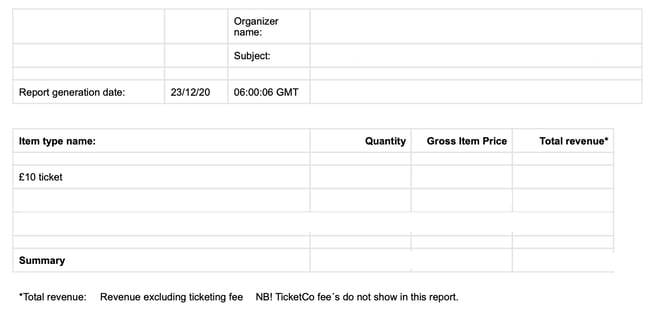 The recipients will receive a PDF which shows the ticket types, number of purchases per type, the gross item price and the raw sales figures (note that TicketCo’s fees are not shown in this report).