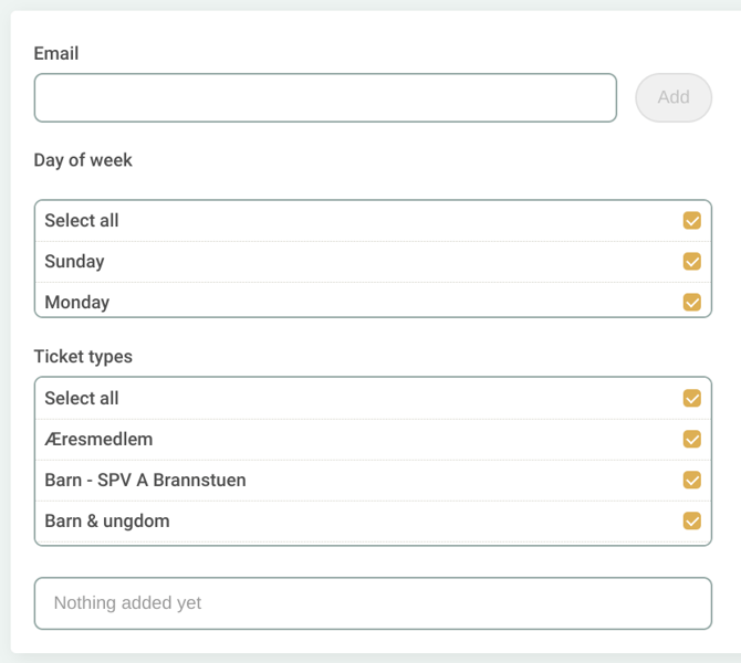 Under Day of week you can select which specific days the recipient should receive the report, and under Ticket types, you can choose which item types should be included in said report. That way you will be able to send summaries to any sponsors or partners you are working with who are interested in sales of specific ticket types.