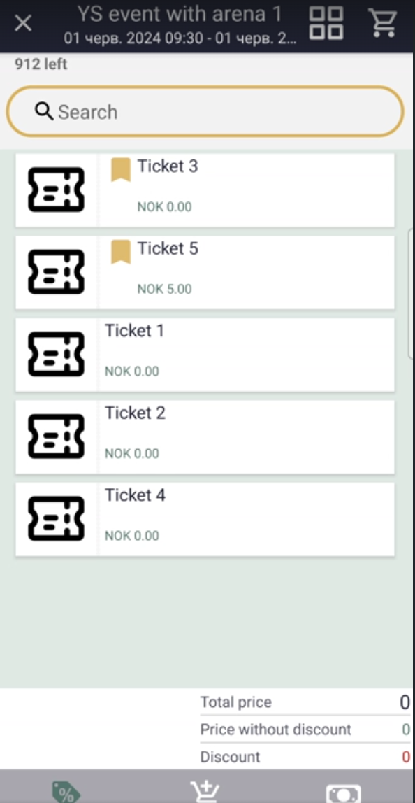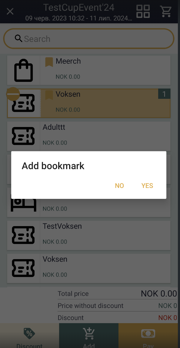 You can bookmark specific ticket types so that they appear at the top of the list of tickets in the POS app, similar to how bookmarking events currently function. Items types can be bookmarked and unbookmarked by pressing and holding the item type in the item types list. The bookmarked tickets will then show at the top of the list with.
