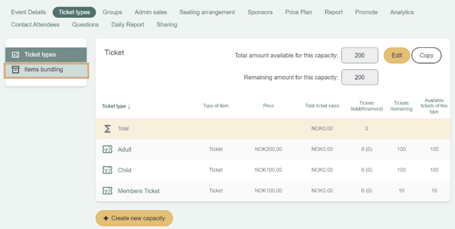 Please be aware that you must first set up the individual items which will be grouped within your bundle. For example, for the "weekend away pack" described above, you would need to set up a) the concert ticket b) the overnight stay and c) the refreshments, within the appropriate events/capacities. If you need help with how to set up ticket types and capacities, check out this support article.