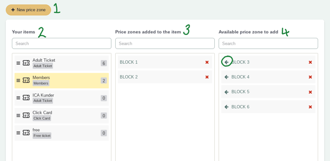 To connect the different zones in your map to your ticket types, select the ticket types under Your items (2). Under Available price zone to add (4), use the blue arrow, circled in the image above, to add the zone to the ticket.