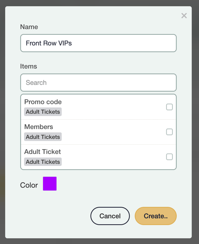 If you want to create your own price zone outside of the ones already in the system, select New price zone (1). You will then be able to name the price zone and select which ticket types you would like to attach to it. You can also choose a custom colour for the price zone in order to highlight it on the map. Click Create when you are ready.