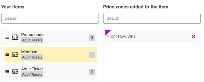Where you previously would have used Groups to order and arrange tickets when you did not have a seat map, you will now use Price zones. Click the three lines on a ticket type and then drag it over the other tickets to the desired position.