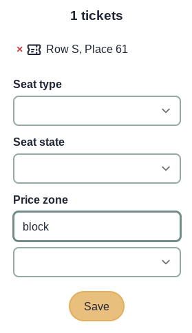 The Price zones feature is where you can assign certain ticket types to certain zones or areas in your seat map. You might, for example, have a VIP section in your map and you would like your VIP tickets to only be available for sale in this section.