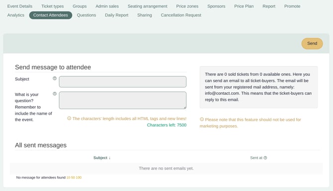Note that the email will be registered as being sent out from the email address attached to your user. That means that if your customers reply to the email, the reply will come to your email address. It is therefore worth checking that the email address you have registered on your user is up-to-date, and that it is the appropriate email address for ticket buyers to contact you on.