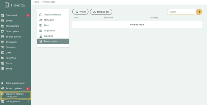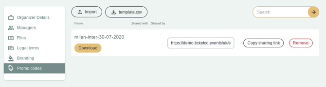 First, locate the unique promo codes module under Organiser settings in the main menu. You will see the Promo codes tab in the left sidebar menu.
