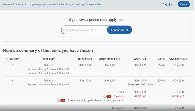 Under Max number of items per order, you can specify how many tickets you want the discount to apply to. For example, if you input 2 into the max items per order field, this means that the discount will apply to 2 tickets per order. If you don't wish to limit the amount of discounts per order, enter 0 in this field.