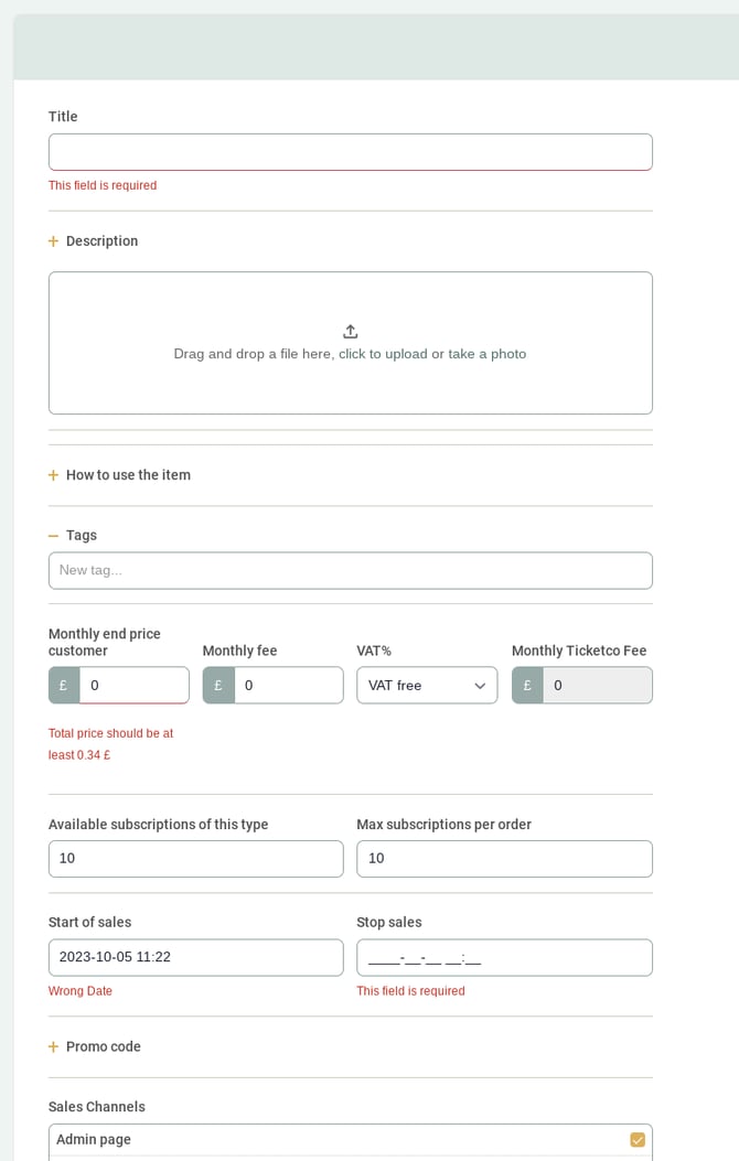 You will, however, notice that there are some differences and limitations on this page. As highlighted above, the Monthly end price customer cannot be 0, as you cannot sell free subscriptions. This end price is what the purchaser will pay each month for their subscription. Notice also that the TicketCo fee is then calculated according to this monthly price, meaning the TicketCo provision is withdrawn from each monthly instalment, and as always, this will be recorded on your invoice.