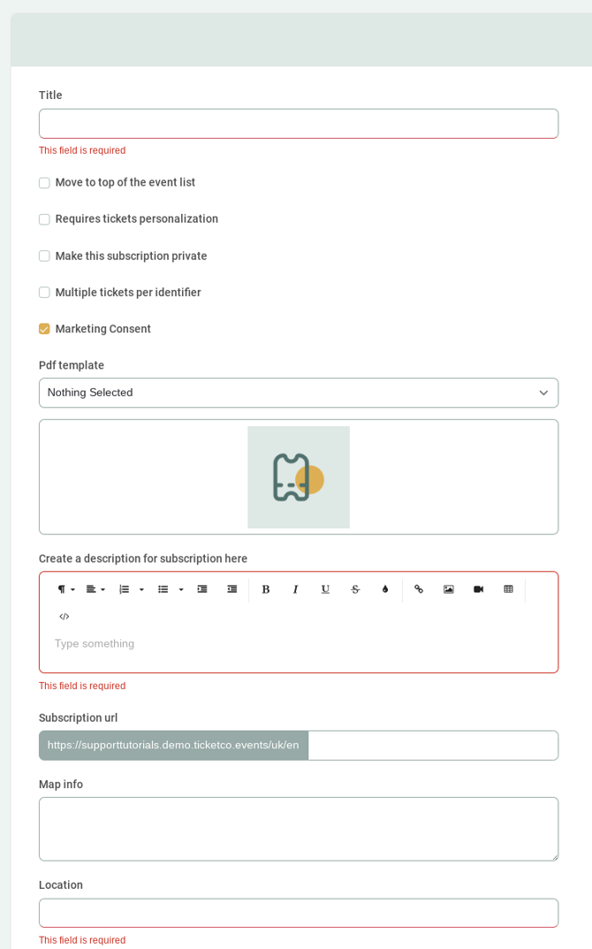 Choose + Create new subscription to start creating your subscription event which will then contain your different subscription types. Fill in the relevant fields with a title, description etc., as you would for a season pass. Read below for advice on what kind of information you should share with your purchasers when it comes to the subscription description.