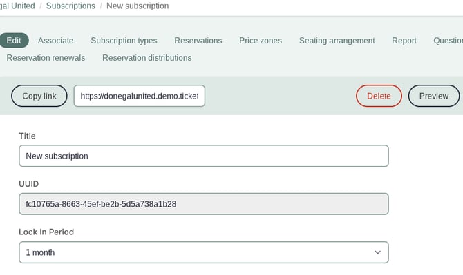 Setting up the subscription eventYou should already be familiar in how to create a season ticket (if you are not, please head this way), so setting up your subscription event and types should be straight forward. The same basic principals apply as when creating a season pass - you input first the general subscription details under Edit and then you set up your various prices under Subscription types. You will then associate a season pass to your subscription, but we will get back to that. Once the module has been activated for you, head to the Subscriptions tab in the main menu. |