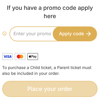 This will introduce a limitation for purchasers which ensures they must have at least one adult ticket in their order when trying to purchase a child ticket. If they do not, they will receive an error message and not be able to go to the next step in the purchase flow: