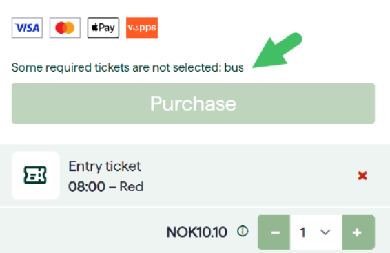 If someone were now to try to purchase the ticket above without adding a bus ticket to their order, they would see an error like this and not be able to continue with the purchase: