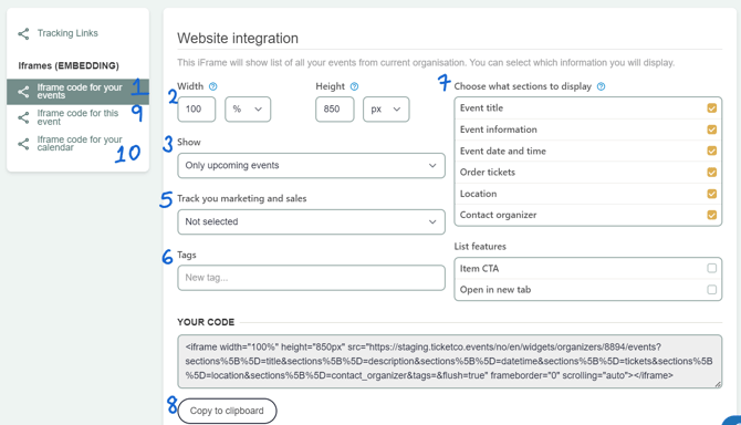 Tags (6) allows you to filter certain events according to the tags they have registered under Event Details. If you have lots of different events, but you want to create an iFrame showing only e.g. your minigolf events, then you could add the tag "minigolf" onto the relevant events, and then type it in here; meaning only events tagged with "minigolf" will be displayed in the iFrame.