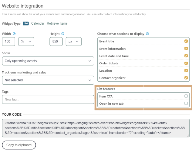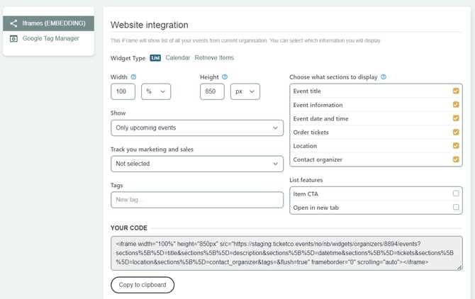 You will customise what information you want your iFrame to display, and in which format, and then the tool will create a code which you can give to your web designers. Your web designers can embed the code in your website, and there you have it - event information and ticket sales all integrated in your page!