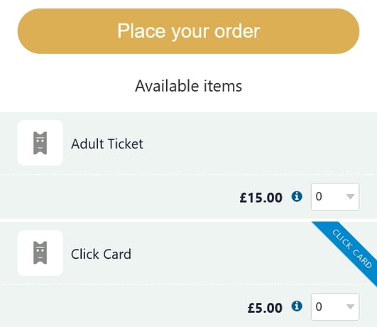 Select the relevant ticket marked with the blue Click card banner, and hit Place your order. Follow the steps in the purchase process until you come to this page: