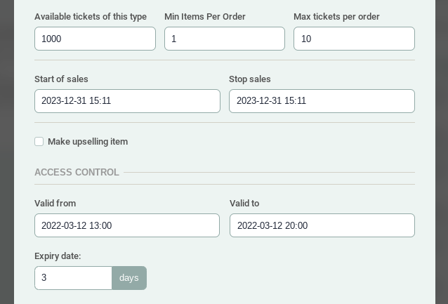 You should also consider for how long your customers should be able to view your content. You can control this under Access Control. Whilst Start of Sales and Stop Sales control when your customers can purchase tickets, the dates you select under Access Control will control when your viewers can access the video. You may, for example, wish to sell tickets in advance of your video release, which is why you may wish to have different dates registered under Access Control.