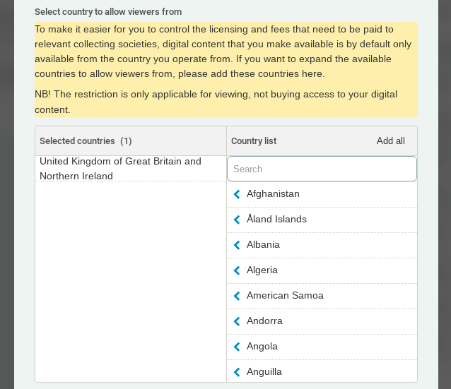 You can also select to which countries you wish to broadcast your content in. You can do this by adding countries to the SELECTED COUNTRIES list.