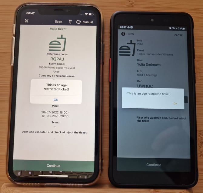 This applies to scanning in both "Approve scan results" and "Continuous scanning" mode as well as group tickets. Please be aware that regular scanning and validation rules still apply, and the user must tap OK on the pop up to continue scanning.