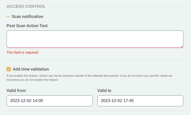 You can now input a warning or message directly onto the ticket types in question, and this will then display during scanning.