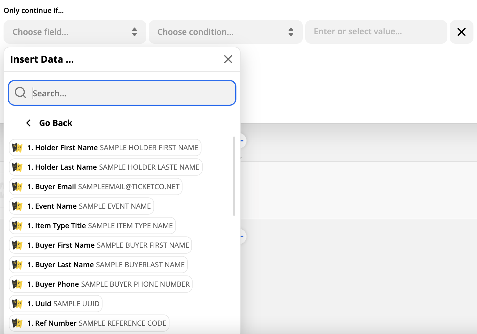 When setting up a Zap with the TicketCo app, the trigger will always be when a new transaction is made in TicketCo. You can use Zapier's filter options to specify if the Zap should trigger only when a certain ticket type or event is purchased. Here is an example: