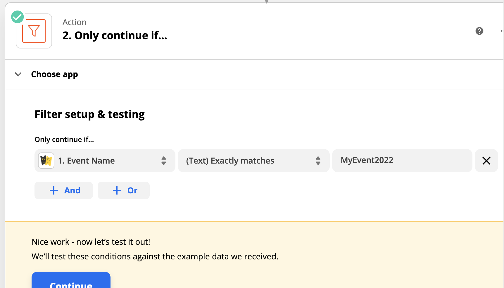 In the above example, we have chosen to specify the event name, so that only transactions belonging to the event called "MyEvent2022" will be affected by your subsequent automation. You could achieve a similar result by using the event ID field, or item type field if you want to specify a certain ticket type.