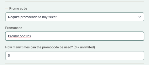 - Under the Promo codes field in your ticket type, choose the option to "Require promocode to buy ticket".