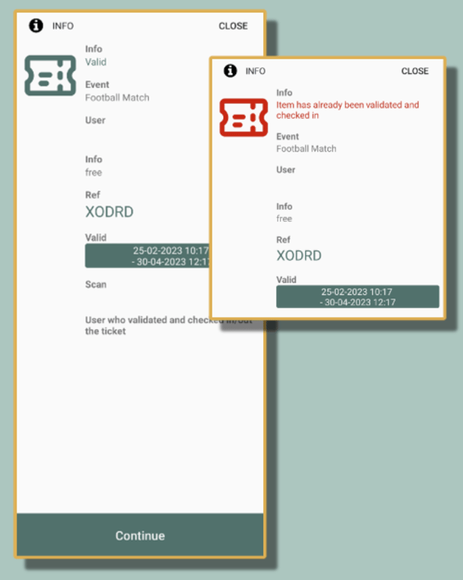 If you select Continuous scanning, then you do not need to press confirm after scanning each ticket. If you select this option, the scanning process will be quicker, but it requires a little more exactness when scanning. We recommend this option for experienced users, but it can also be easier for newer users as it requires less interaction with the app. When using this mode you will see a green response each time a valid ticket has been checked in, a yellow response if you have checked in the ticket within the past 15 seconds and a red response if the ticket is not valid (and thus not checked in).