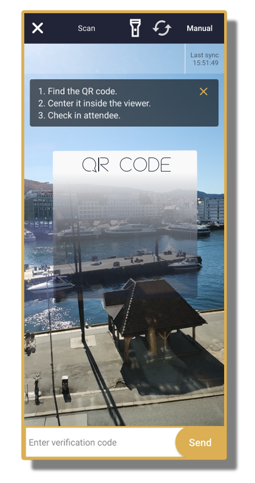 This method may be useful if the customer cannot open the ticket link, or if you cannot scan the QR code. You will find the customers' reference code on their ticket, and it will consist of 5 or 6 letters. Simply input this code in the Enter verification code box at the bottom of the screen and select Send.