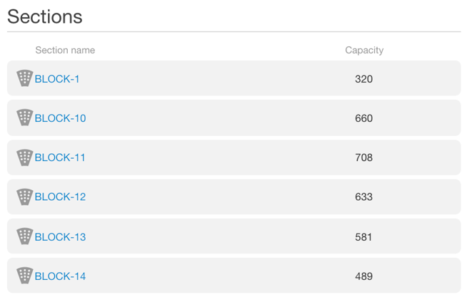 In the example above, this means that Block-1 can hold a maximum of 320 tickets, and Block-10 can hold a maximum of 660 tickets. This applies for every event and season pass using the map. That is to say that this capacity cannot be exceeded on any event using this map.