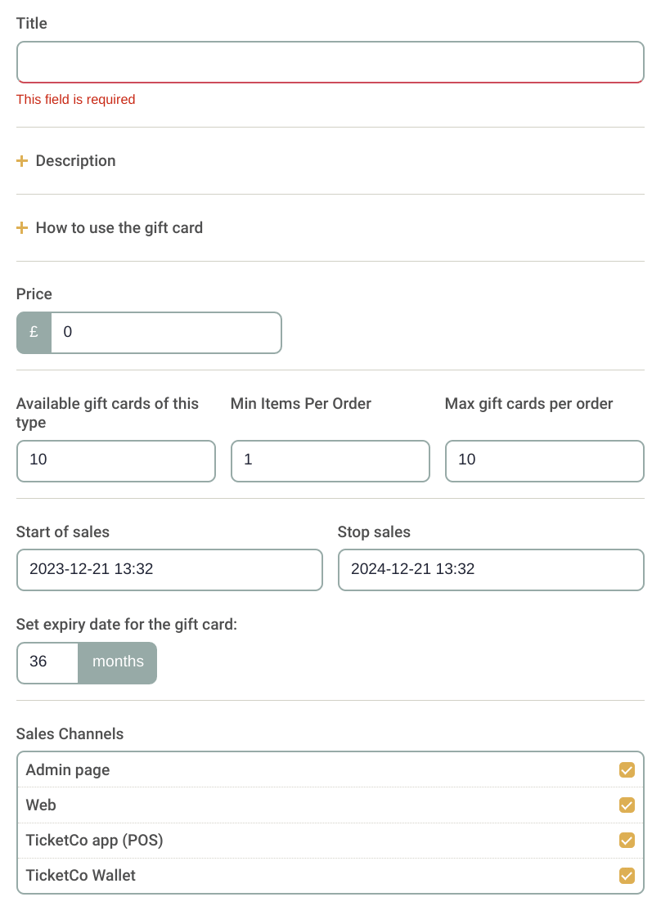 - Add a title. You may want to add some terms and conditions in the Description or How to use the gift card field.