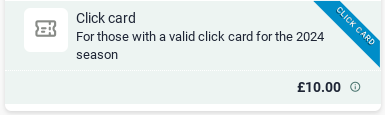 When purchasing a ticket with a click card, the customer journey looks pretty much the same as for ordinary tickets, except that the customer must input their click card reference code when purchasing an item marked with a blue Click card banner.