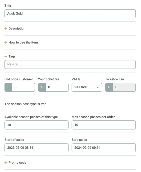 Next, go to Season pass types to set up your different season ticket prices. Here you can see we have created an adult season ticket, and you could also set up season passes e.g. for children or VIP, or with different price brackets.