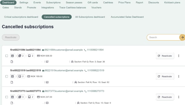 You have the capability to select one or multiple cancelled subscriptions from this dashboard and proceed with their reactivation by clicking the ''reactivation'' button on the right hand side.