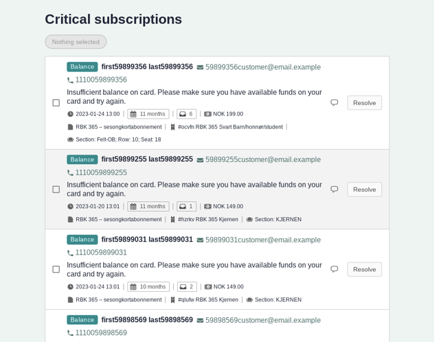 Each block on the Critical subscriptions dashboard represents a subscription which has not been settled for one or more months. There can be various reasons for this, and you will see a description of the reason marked at the top left of each block and in the descriptive text.