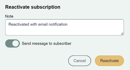 If the "Send message to subscriber" toggle is enabled (which it is by default), the subscriber will receive an email notification upon reactivation.