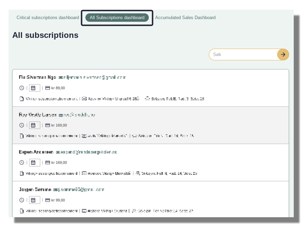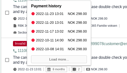 The timestamp you see in the line below reflects when the subscription was made overdue, and thus when it entered this list. Next, you will see a summary showing how many months it has been since the subscription was first purchased, and if you click on this, you will see the Payment history on the subscription. Red marks any failed payments, and green ticks indicate successful ones.