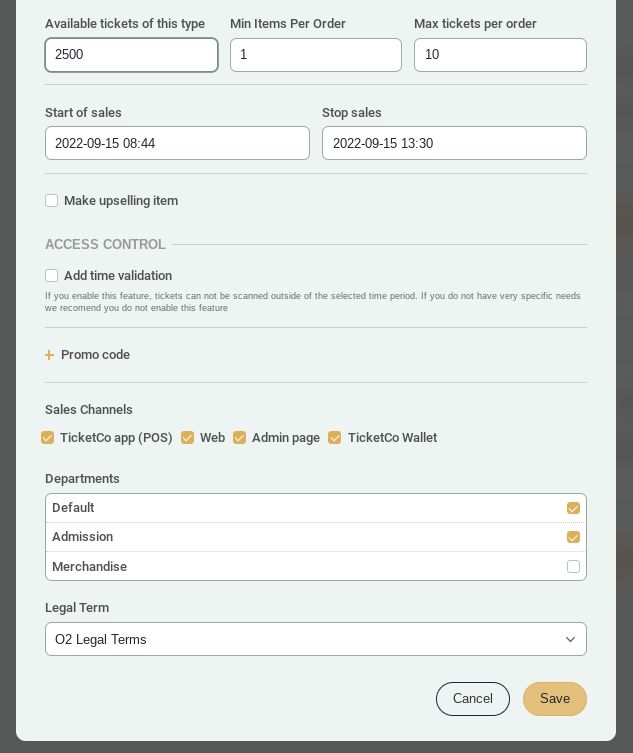 This can be used to make tickets only available in specific channels. You might want, for example, expensive tickets to only be available on the door, and cheaper tickets to be available on the app. It is also a great tool for ensuring that complimentary tickets are only available for sale in the admin pages.