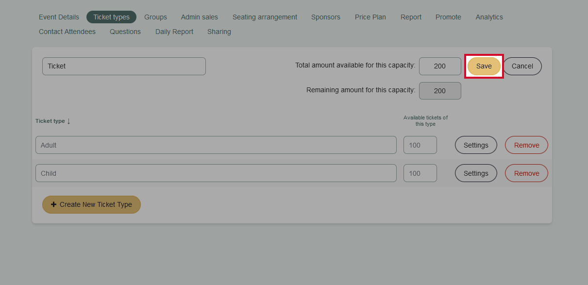 Once you have inputted all the relevant information, you can save your ticket type. Repeat the process until you have added all the ticket types you need. Once you have finished, click Save in the top right: