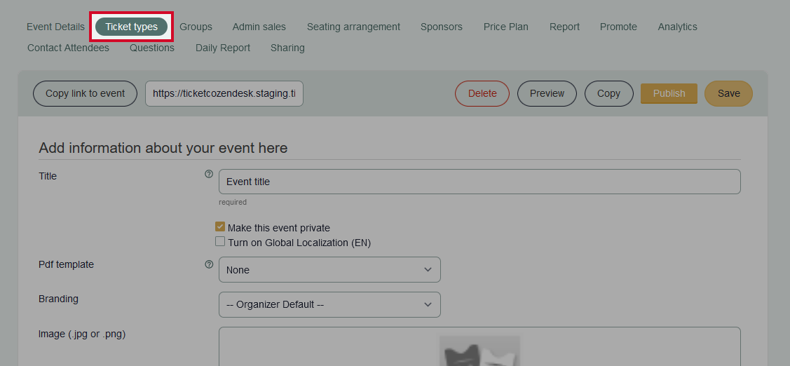 In this article we will explain how you set up your ticket types, prices and how to configure your ticket settings. To set up your ticket types, click the tab labelled Ticket types next to Event details.