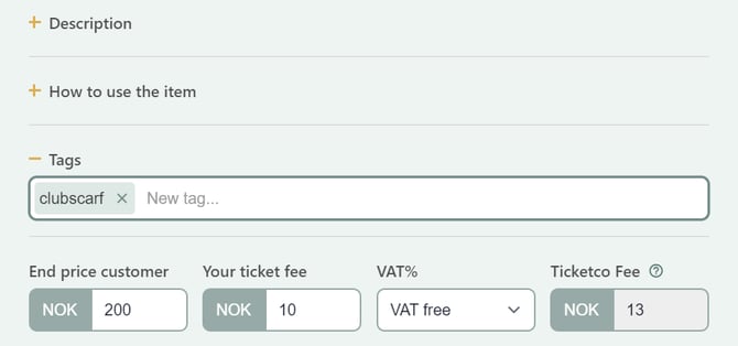 - Under the ticket type settings, go to +Tags and enter your tag, "clubscarf".